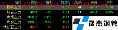 今日螺紋主力期貨跌138,收?qǐng)?bào)4637,跌幅2.89%;熱卷主力跌95,收?qǐng)?bào)4804,跌幅1.94%;焦煤主力跌12.5,收?qǐng)?bào)2635,跌幅0.47%;焦炭主力跌23,收?qǐng)?bào)3391.5,跌幅0.67%;鐵礦石主力漲3,收?qǐng)?bào)703,漲幅0.43%。