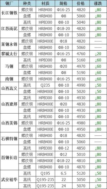 15日廣東河源德潤鋼鐵到廠跌30:鋼筋切粒3460;邊角料,新鋼板料3430;純鋼筋頭,直鋼筋3410;模具鋼、料頭圓鋼、軌道鋼、火車輪3410;硅鋼片停收;冷軋、熱軋、碎料沖子3360;優重3410;鍛打料、馬蹄鐵3410;重廢3360;機械生鐵、高碳鋼、鑄鋼件、生熟混裝3360厚剪3310不含稅