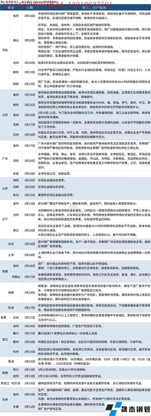 好像是一夜之間,疫情再次卷土重來。截至3月21日,16個省份停工復工情況見下表。其中,3月21日,南京全市范圍內除保障市民生活和城市基本運行的水、電、燃油、燃氣、通信、環衛、糧油肉菜供應等公共服務類企事業單位外,其他有條件的單位盡可能安排居家辦公。3月20日,唐山開平區、豐南區、灤州市、遷西縣全域實施嚴格封控管理;大部分鋼企維持生產,但政府實施道路管控,精密管廠家均面臨運輸方面的問題。深圳全市福田、羅湖、南山、寶安、龍崗以及龍華暫未恢復,全市封控區、管控區、防范區繼續嚴格執行疫情防控相關措施。山東濰坊、日照、青島萊西市實現社會面動態清零。河北滄州連續4天實現社會面動態清零,3月20日起部分地區逐步解除封控。